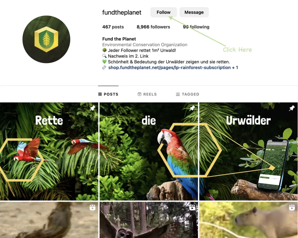 - Finden und folgen @FundThePlanet auf Instagram: Wenn du uns folgst, trägst du sofort zum Schutz des Regenwaldes bei.